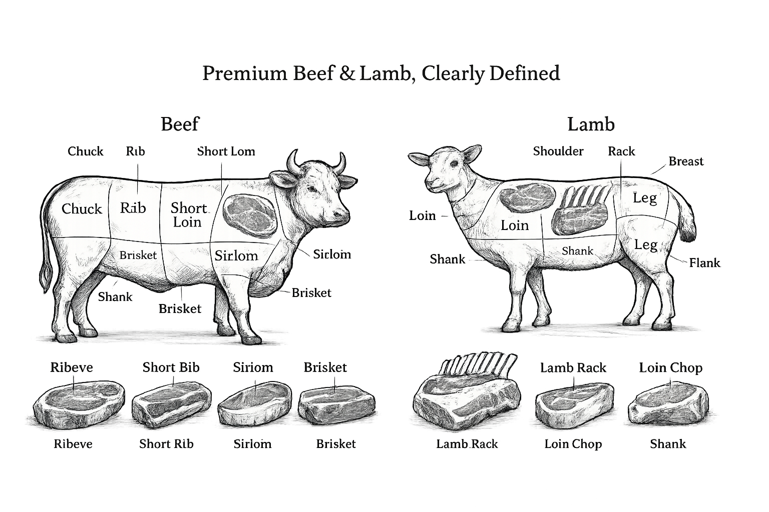 Every cut, from ribeye to lamb racks, is carefully selected and clearly defined. Premium beef and lamb, with total transparency.